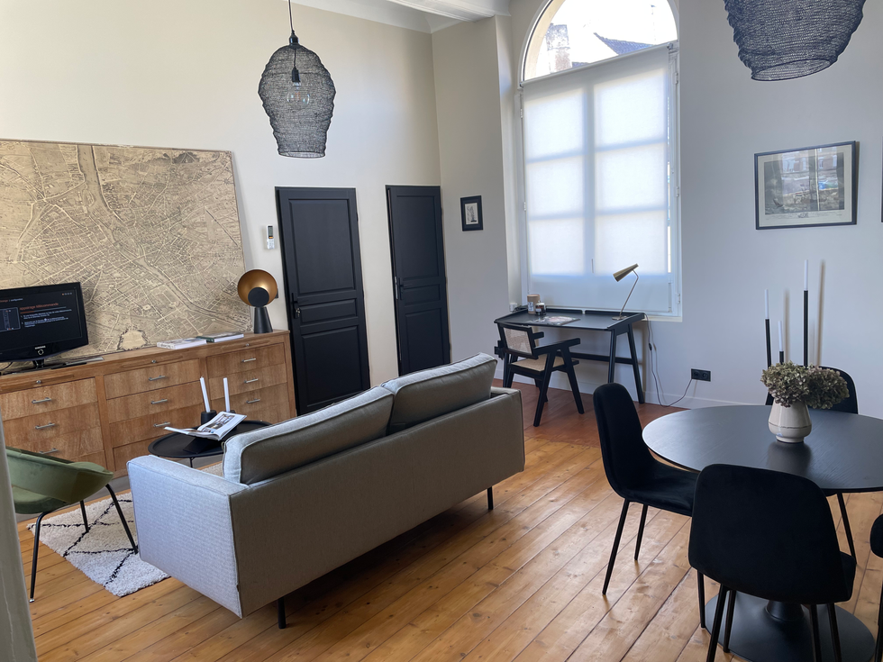 Rénovation complète d'un appartement de style "haussmanien" de 50 m² : salon, cuisine, salle de bain, chambre.
